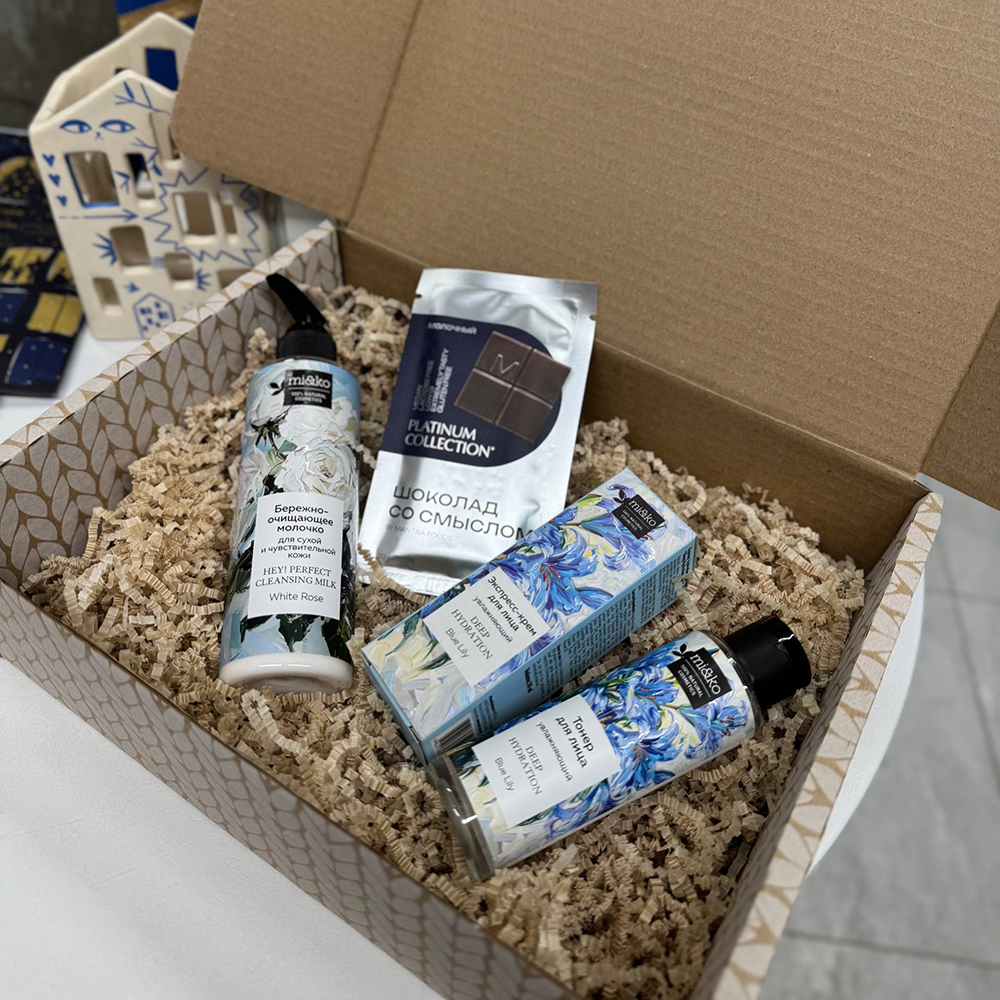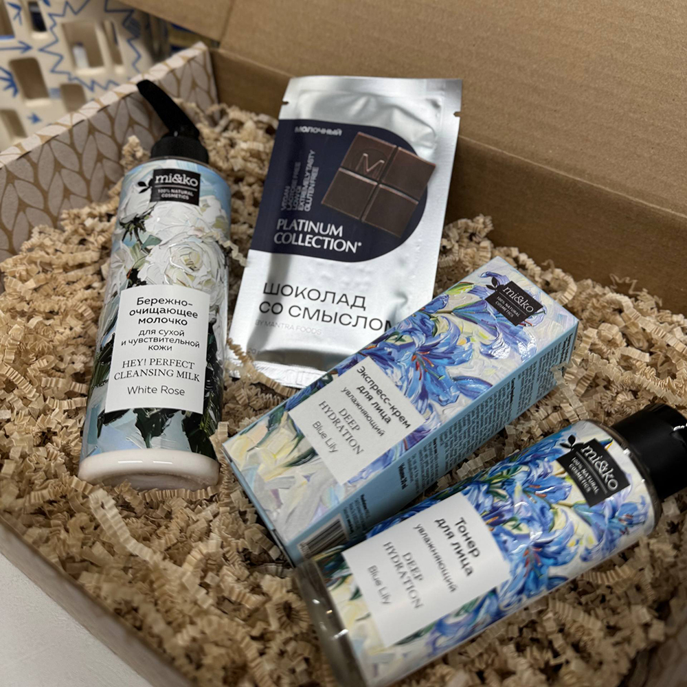 В набор входит: Бережно-очищающее молочко Hey! Perfect cleansing milk White rose Miko; Экспресс-крем для лица для сухой кожи Deep Hydration Blue Lily Miko; Увлажняющий тонер Deep Hydration toner Blue Lily MiKo; Шоколад со смыслом Молочный Mantra Foods; Подарочная упаковка; Наша фирменная открытка.