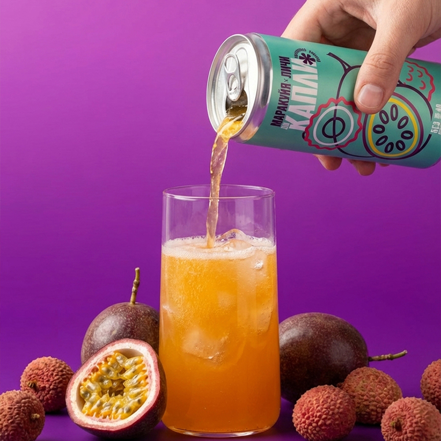 Яркая кислинка маракуйи встречается с деликатной сладостью личи. Плотная тропическая мякоть и лёгкая цветочная нотка создают баланс: не приторно, но насыщенно.